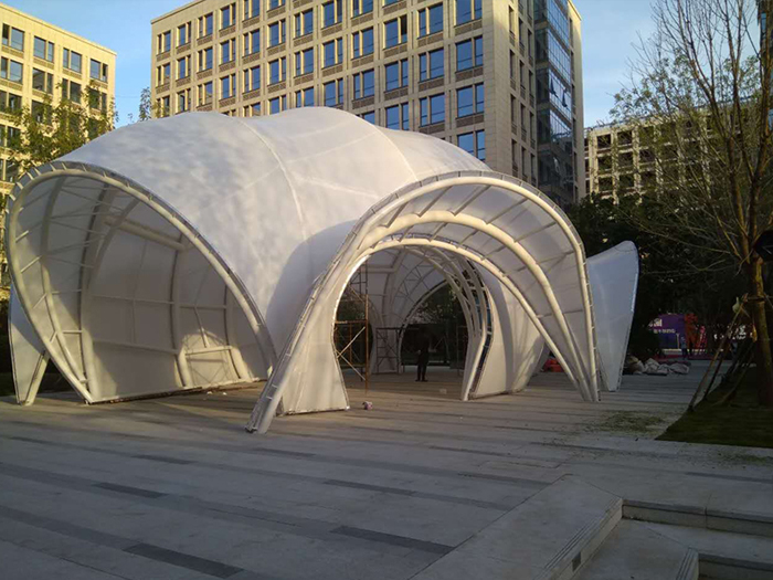 景觀膜結構又稱張拉膜景觀,主要通過膜結構的張拉式 呈現出唯美的結構特征;膜材料是指聚酯纖維基布或PVDF、PVF、PTFE等不同的表面涂層,配以優質的PVC組成的具有穩定的形態,并可承受一定載荷的建筑紡織品。它的壽命因不同的表面涂層而異,一般可達成10-20年;其外觀整潔大方,自潔性強。主要應用于各大公園,世博園,和一些廣場,商場等場所。