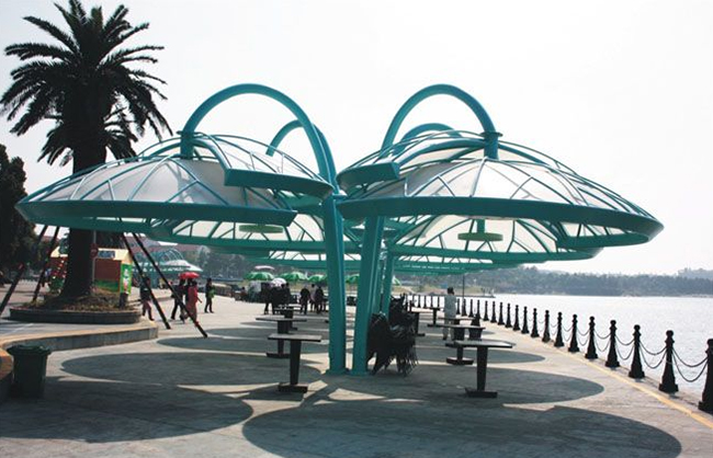 景觀膜結(jié)構(gòu)又稱張拉膜景觀,主要通過(guò)膜結(jié)構(gòu)的張拉式 呈現(xiàn)出唯美的結(jié)構(gòu)特征;膜材料是指聚酯纖維基布或PVDF、PVF、PTFE等不同的表面涂層,配以優(yōu)質(zhì)的PVC組成的具有穩(wěn)定的形態(tài),并可承受一定載荷的建筑紡織品。它的壽命因不同的表面涂層而異,一般可達(dá)成10-20年;其外觀整潔大方,自潔性強(qiáng)。主要應(yīng)用于各大公園,世博園,和一些廣場(chǎng),商場(chǎng)等場(chǎng)所。